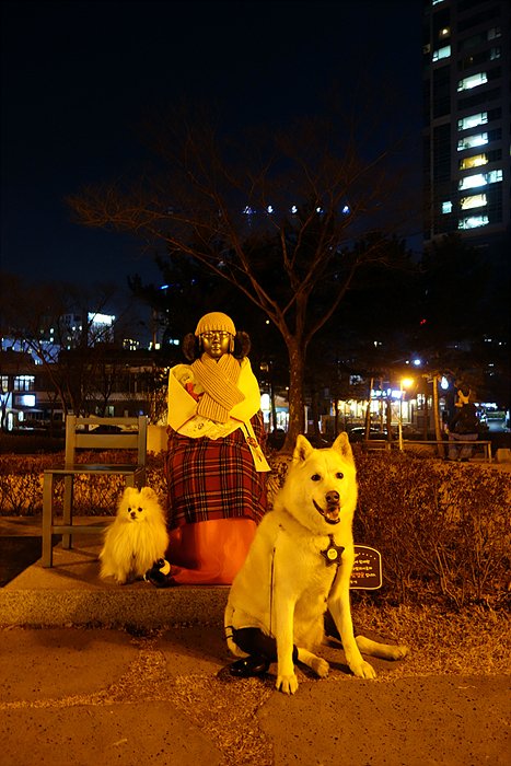 울산대공원까지 걸어왔는데. 공원 입구쪽에 소녀상 앞에 기다려 시켜놓고 사진 찍어봤어요.