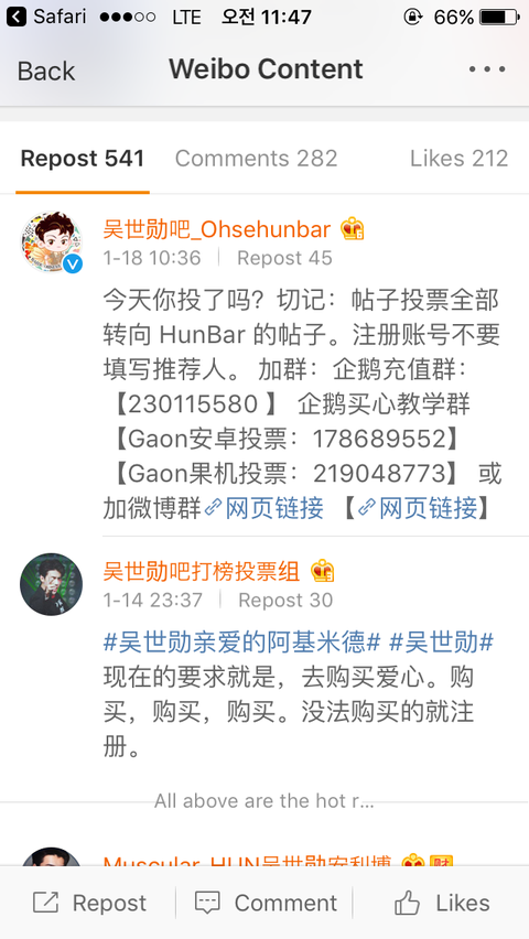 세훈중국팬덤에서 무한결제유도하는 방법과 독려를한게 이제서야 발각됨 14일부터 지금까지 꾸준히 했고 세훈바에서 리포스트까지했음