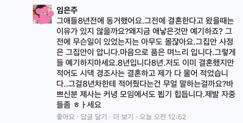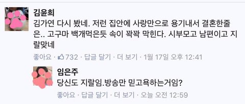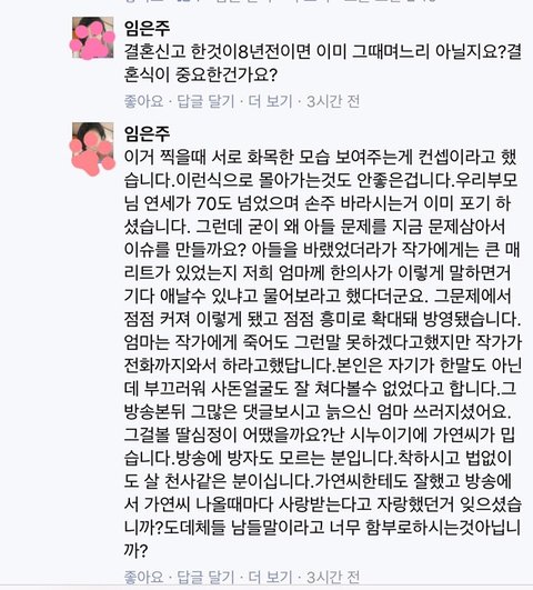 반댓수가 엄청날것같긴 하지만 이여자 말대로 방송에서 보이는거 말고 우리가 모를만한 진짜 속사정이 있을수도 있지않나. 물론 임요환 아버지가 잘했다는건 진짜 아님. 나도 그 캡쳐보면서 김가연이 보살인가 어린남편 데리고 살면 저런 취급당해야하나 재혼이 흠인가 도대체 왜 참나 이런 생각 엄청 많이 했는데 그건 어디까지나 방송에 보여진것만으로 생각든거고 내가 뭣도 아닌데 남에일에 왈가왈부 하나 싶었음.근데 시누는 네티즌들보다 더 깊은 속사정도 다 알거고 자기 부모 욕먹는데 좋아할 자식은 없지않음? 충분히 저럴수있다고 생각하는데..