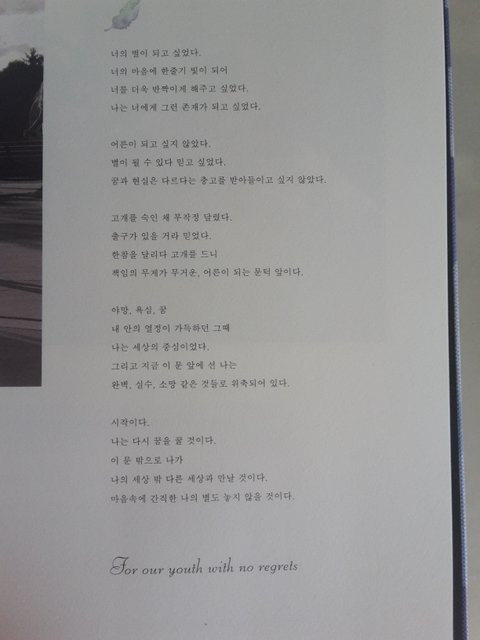 Now3 마지막장임 밑에 보면 for our youth with no regrets 우리들의 후회없는 청춘을 위하여. 결국 now3에서 전달하고 싶은건 방탄이 소년에서 어른으로 성장해나가는 도중에 겪게 되는 불안함, 슬픔 등의 혼란스러운 감정을 통해 한층 더 성숙해져가는 모습. 이제 어른이라는 세계에 한발짝 다가서게 됐지만 순수하고 여리던 소년의 마음은 그대로 간직하겠다는 마음임. 그걸 전달해주고싶었던거. 절대 ㅅㅌ를 나타내는 화보가 아니란거임.