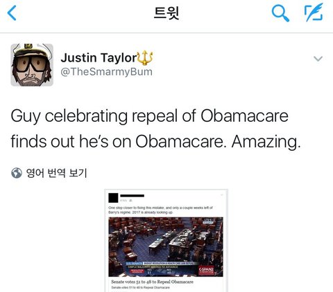 "드디어 오바마 케어가 폐지되겠어! 2017년이 기다려지는걸!" "이봐, ACA를 받는 사람들을 이렇게 무시하는건 너무한걸.이건 누군가에게는 불행이라고." "야. 난 오바마 케어를 얘기하고 있는거고 ACA를 얘기하고 있는게 아니야.그리고 나도 ACA 보험 적용을 받고 있어. 도움이 필요한 사람을 무시하지 않아. 오바마 케어는 처음부터 실패였고 제대로 돌아가지도 않았어.드디어 실수를 고칠 기회가 온거라고." "잠깐. 미친; 너 오바마 케어 대상자라고?;; 너 이제 보험 잃을거야; " "난 오바마 케어 대상자가 아니야. 내가 받고 있는건 ACA (Affordable care act)지.-오바마 케어가 엉망진창이 되어버려서 그들이 내놓은 대안이지-그러니까 내 건강보험은 괜찮을거야!" "너 지금 장난해? 뿅뿅 그 두개가 같은거라고!오바마케어는 공화당이 ACA에 붙인 멍청한 이름이고!너처럼 멍청한 투표자들이 이름만 듣고 ACA를 싫어하게 만들려고 말이지!널 보니까 조카 효과가 있었네."