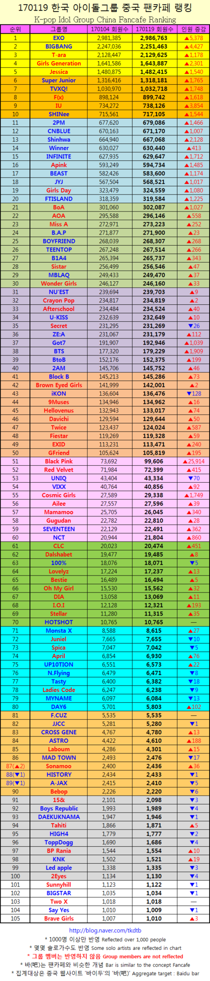 2017 1월 17일 기준 아이돌 총합 랭킹
