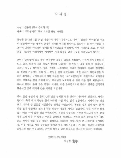 3. 마지막으로 여성시대라는 커뮤에서 나온 엑소 리더 수호에 관한 루머를 해명하고자 합니다. 여성시대에서는 엑소의 리더인 수호(김준면)의 아버지 김용하 교수님이 친일파 단체인 뉴라이트라는 집단에 속해있다는 글을 올렸습니다. 이러한 루머글은 삽시간에 퍼졌고 결국 김용하 교수님은 소송을 진행하게 되었습니다. 그리고 소송결과 김용하 교수님이 속한 단체는 친일파 단체가 아닌 것으로 밝혀졌습니다. 이와 관련해서 여성시대 첫 루머 유포자도 본인의 잘못은 시인하고 사과문을 올렸습니다.