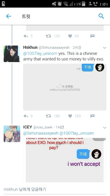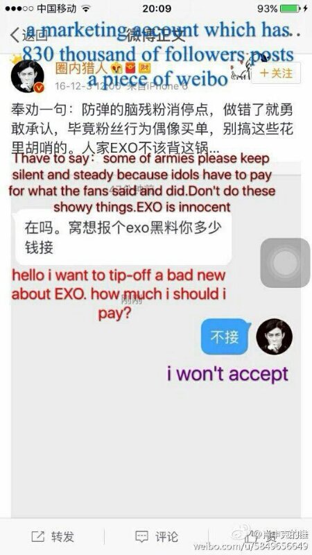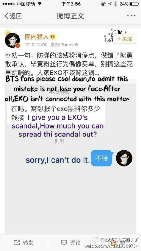 야 쟤 말에 의하면 역으로 쟤네 중국팬쪽에서 우리 안좋은 루머(?) 포스팅 해달라 했다는데? how much should i pay 얼마 줘야되냐 묻는거 맞지? 내가 제대로 이해한거 맞음?