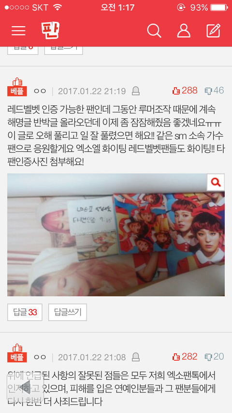 타 팬덤 일이고 상황도 제대로 모르면서 끼어들면 우리랑 레벨만 욕먹어 단독행동 하지 말라고 몇번 말하니 타팬덤끼리 문제에 소속사 같다고 댓글달고 그러지 마 대댓만 봐도 함부로 끼어들지 말라는데 혹시라도 저 글에 레벨팬이라면서 누구 한쪽 옹호해 주는 댓글 쓴 사람 있으면 지워 우리 제발 남일 끼어들어서 욕먹지 말고 그냥 우리끼리 평화롭게 덕질 좀 하자고