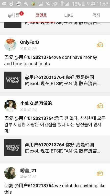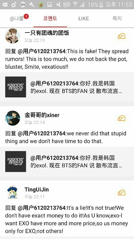 바이두에다 한국엑셀인데 b퇑팬이 너네에 대한 루머를 올렸다 너네가 기자한테 돈주고 매수해서 블라블라 하고 이거 퍼트려달라 한다음에 걔네가 욕한거 번역해서 사진한장 올림 그랬더니 메시지 몇백개씩 옴 한국어로 오고 영어로 오고 했는데 다들 빡친듯ㅇㅇ