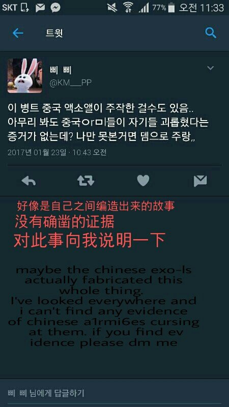 어떤애가 너무 순화됐다 해서 다시함 어떤 글 댓글에 적혀져있는 영어도 혹시 몰라 적음 중국어는 자기네들끼리 꾸며낸 이야기 같아 명확한 증거가 ㄹ없어 이 일에 대해 잘 알면 나한테 설명해줘 이런뜻
