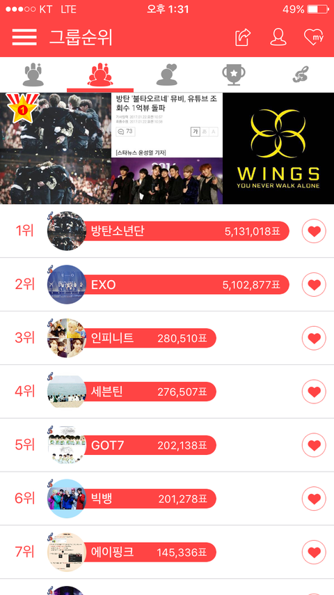 앱이름은 최애돌이구 여기 순위대로 가온차트 인기상 정한대! 카톡으로 로그인 바로 가능하고 하트로 투표하는건데 매일매일 몇백개씩 쉽게 모을수있어