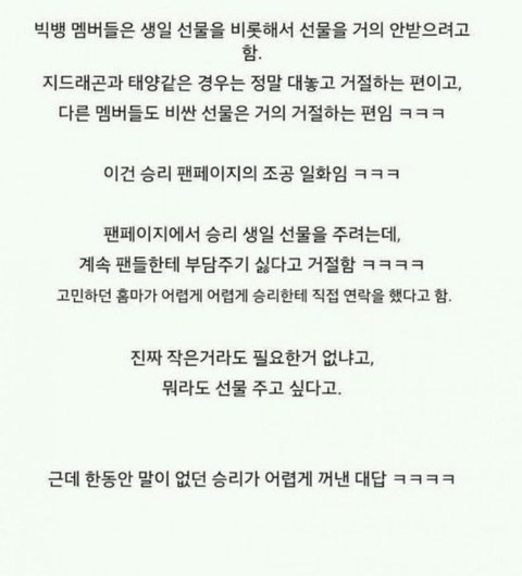와이지 빅뱅 조공 아예 안받아줌;; 팬으로써 해준게 없다 받아먹기만 하고 ㅠㅠ