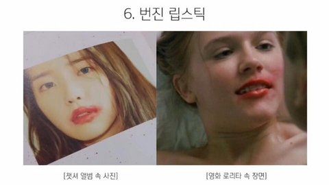 하지만 디바제시카는 이 사진을 들고와서 "번진 입술은 로리타 클리셰 중의 하나이다" (로리타 영화는 두 편이 나왔지만 번진입술의 장면이 나온건 1997년 영화 하나밖에 없으므로 번진입술을 로리타 클리셰라고 보기 힘들다는게 사실입니다.) 라고 말하며 아이유가 로리타 컨셉을 했다고 말씀하셨지만 전혀 사실이 아닙니다.