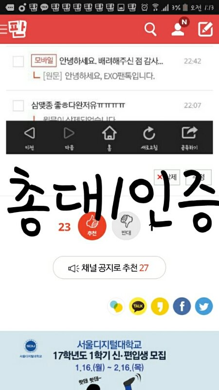 안녕하세요. 방탄소년단 팬톡입니다. 글을 쓰기에 앞서 저희는 사과문을 올리기로 하였으나, 글총대가 없어지는바람에 제 시간에 글을 올리지 못하였습니다. 시간이 늦더라도 너그럽게 이해해주신 엑소엘분들께 다시 한번 잘못을 저지른것같아 죄송합니다. 새로운 총대를 구하였으니 조금만 더 시간을 주신다면 좀 더 깔끔한 사과문을 올리도록 하겠습니다. 늦은 밤까지 기다려주셔서 감사하고 한편으론 죄송합니다. 또, 엑소팬톡에는 여러개의 사과문이 올라왔었는데, 이는 아미들의 개인행동입니다. 팬톡을 혼란스럽게 하여서 죄송합니다. 빠른 시일 내에 사과문을 재점검해 올리도록 하겠습니다.