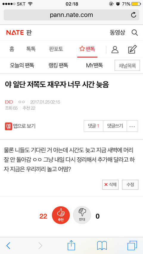 지금은 시간 너무 늦었으니까 저쪽보고 오늘 오전이나 오후에 시간 정해서 다시 올려달라고 그래 지금 시간으로는 화력도 별로라 저쪽 사과문 수정하는 거 더 힘들 것 같고 여기애들도 자야하는 애들 많아 ㅇㅇ 내가 올린 글에 추천수 많이 달렸고 그러니까 저쪽보고 내일 올려달라고 말 좀 해줘