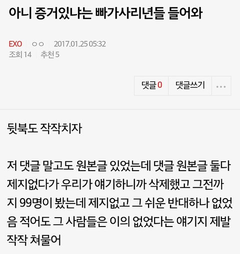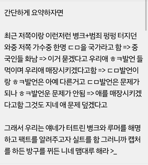 -애초에 저쪽련들이 멍청한게 자기가수가 ㄹㅇ 잘못이 없다 생각했으면 ㅂㅁㄱ하면 끝날일인데 찬열이를 끌여들였다는거. 지들이 식겁해서 ㅈ됐구나 싶으니까 엑소로 일 덮으려 했으나 더 키웠고,, 자기가 직접 자기가수 잘못 있다는거 인증한꼴,,