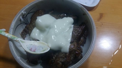 스테이크덮밥입니당. 근데 치즈랑 안어울렸어요..