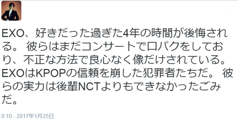 EXO, 좋아했던 지난 4년의 시간이 후회된다. 그들은 아직 콘서트에서 립 싱크를 하고 부정한 방법으로 양심 없는 상만 타고 있다. EXO는 KPOP의 신뢰를 무너뜨린 범죄자들이다. 그들의 실력은 후배 NCT보다 못한 쓰레기이다.