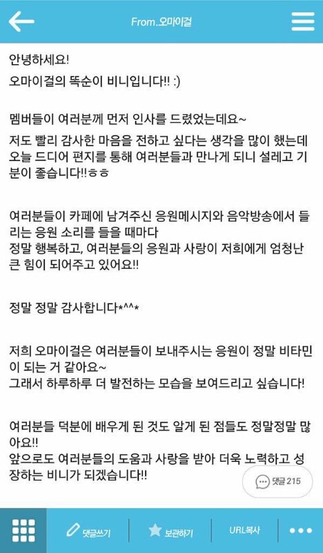그리고 오마이걸에서 보면 비니가 가장 눈에 들어옴 말하는 것을 봐도 그렇고 행동을 봐도 그렇고 엄청 예의 바르고 가족들에 대해서 말하는 것을 보면 가족 사랑도 대단한 것 같음 인사도 선배들한테 언급이 계속 나올만큼 엄청 잘 하고 그래서 요즈음 더 호감이 간다 오마이걸 파이팅~!