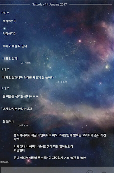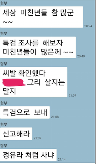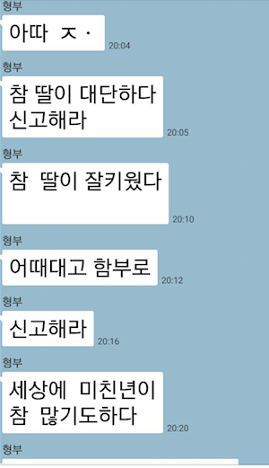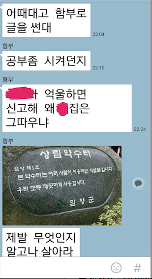 가족 톡방에 내 기분을 말했음.초반에 잘 설명하다가 흥분했는기 결론에서 반말로 끝남.그 톡방에서 그 누구도 대답을 하지도 않았고 개인적으로 내게 괜찮냐며 걱정의 안부따윈 없음다행이 답장 하나가 왔음 그 단톡방에서 스 1.8새.끼로부터' 근데 너 여기 어른도 있는데 왜 반말해? '