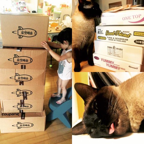 고양이님 모래와 사료와 간식으로 꽉꽉찬 택배 6박스 입니다
