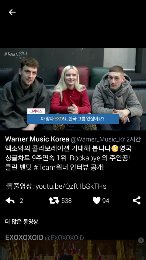 한국 그룹 엑소? 너무 반했다고 노래도 너무 좋고 그들도 좋다면 같이 작업하고 싶어요 래 ㅇㅇ 쩔음