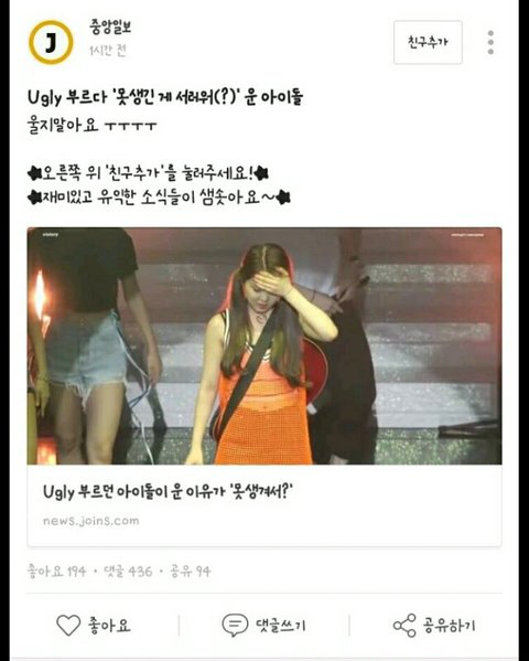 이거임 ㅋㅋㅋ 물론 기사 내용에는 못생긴 게 서러워서 운게 아니라 감동 받아서 운거라고 썼지만 저런 제목을 내놓고 글을 쓰면 사람들은 당연히 그 기사 제목만 보고 오해를 충분히 할 수 있는 제목임 ㅋㅋㅋㅋ