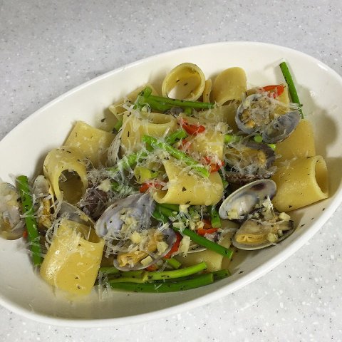 바지락과 마늘쫑을 이용해서 봉골레를 만들어봤어요. 면은 길죽한 면은 식상해서 속이 뻥 뚤린 대왕 면을 선택했죠.