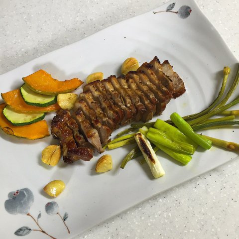 무항생제 삼겹살을 이용한 오븐구이를 해봤어요. 각종허브류와 조미료를 이용해 1시간정도 마리네이드를 한 후에 오븐에 1시간정도 구운것 같아요! 음 겉은 바삭바삭 속은 촉촉하게 아주 잘 익었답니다. 주변에 가뉘시들도 함께 오븐에서 구워 줬어요!
