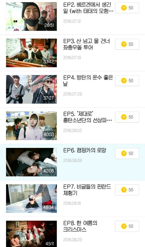 방탄 본보야지는 1편당 50코인, 돈으로 치면 한편당 1100원을 주고 봐야됨(본보야지는 총 9편)