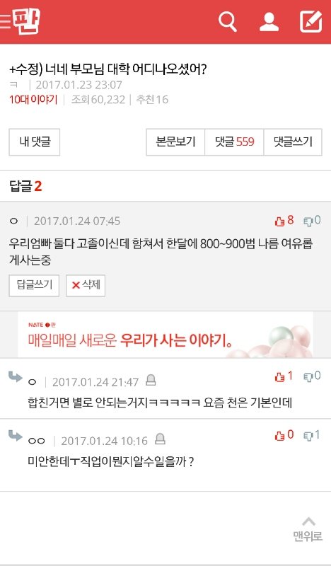 내가쓴댓글 보다가 대댓봤는데 요즘은 합쳐서 천버는게 기본이야...? 나름 여유롭다고 생각했는데... 상중하로 나누면 하위층같은건가...ㅠ.ㅠ뭐지