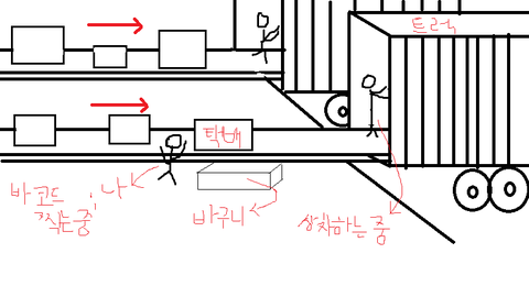 이 일은 그냥 바코드찍는 기계 들고 앞에서 택배들이 내 쪽으로 오면 하나씩 찍어가지고 뒤로 밀어주면 되는 일이었음 생각보다 쉽네~ 하고 있었음