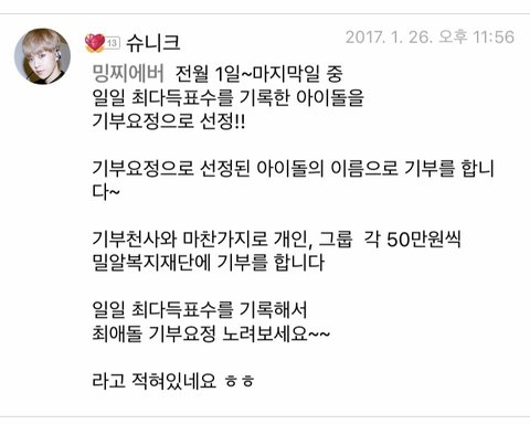 불판에서 본건데 '민석이를 좋아하는 사람들이 진짜 많다는 것만 알아도 전 정말 행복합니다^^ ' 이말을 보고 우리팬들한테 너무 감동받았어 ㅠㅠㅠ 이렇게 좋은 사람들과 함께 할수있다는것 만으로도 나도 너무 좋고 행복하다 민석이랑 웅녀웅남 그리고 엘사들 모두 산랑해♥♥♥