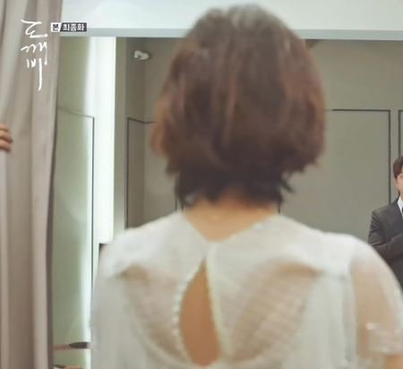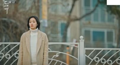 깃털을 잡고 뒤에 인기척을 느낀 김신은 뒤를 보는데 그곳에 천사의 모습을 한 은탁이 서 있다.