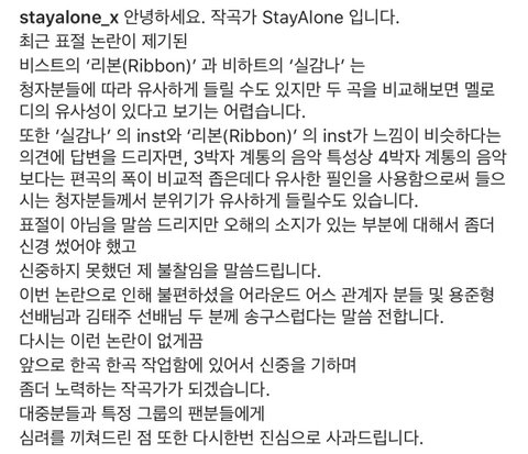 표절을 절대 인정안하고 3박자니 편곡이 좁다느니 핑계를 댄 글을 올림