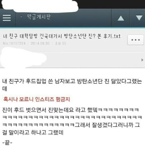 에이..그걸말리냐고하냐니..아무리그래도 김석진이 처음보는팬일수있는분한테 예의없게그런식으로말하진않았을듯 물론 웃으라고글올린건데..넘 주작ㅋㅋㅋㅋㅋㅋ보고웃긴했음 ㅇㅇ8