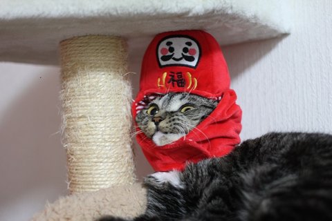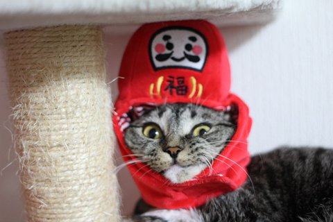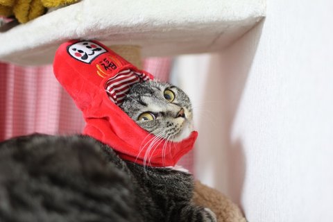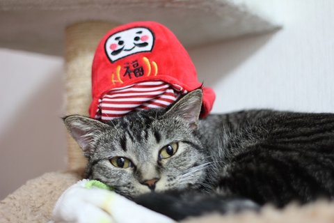 1월 1일에 새해 기분을 내보려고 샀던 애묘용 <복> 모자를....4마리의 고양이가 모두 격하게 거부했던 그 모자를....모모에게 다시 씌워봤어요. 씌웠다기보다 살짝 얹어봤네요. 소심하게ㅋㅋ