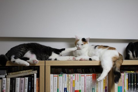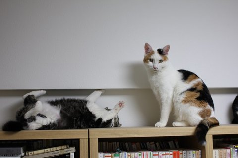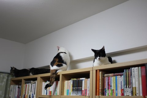 눈치채셨나요? 나나가 책장 위에 올라갔어요. 제힘으로! 점프를 할 수 있게 됐냐고요? 아니요, 머리를 쓸 줄 알게 됐어요ㅋㅋㅋ 프린터를 밟고, 커튼 봉을 타고, 산 넘어 물 건너 돌고 돌아 책장 위로 올라가는 방법을 터득했어요. 이로써 4마리가 책장 위에서 영역싸움을 하게 됐습니다. 영역싸움을 하면 어떻게 되냐고요?