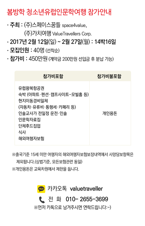 2017 봄방학 청소년유럽인문학여행 신청합니다!