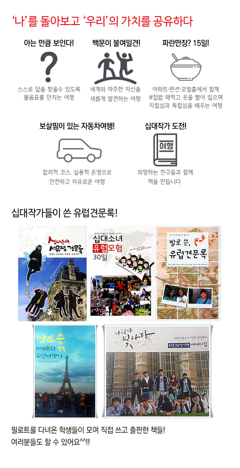 - 포함내역 : 항공권, 숙박, 현지이동경비(자동차/유류비/통행료/카페리탑승), 인솔교사가 전일정 운전과 인솔, 식사, 인문학자료집, 단체후드집업, 식사 - 배움과 여행에 필요한 경비들 포함)