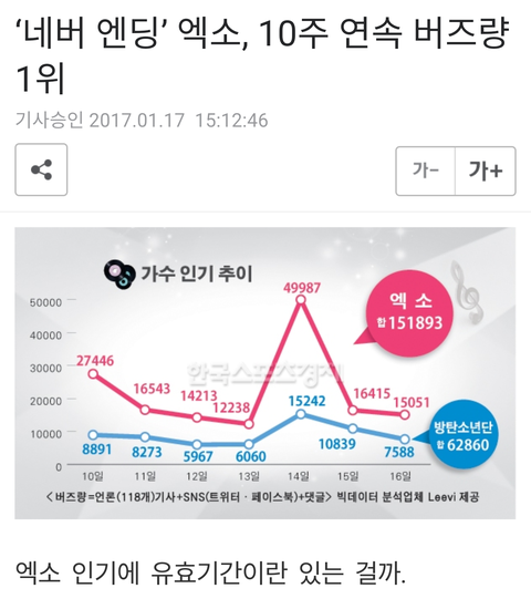 엑소가 한류스타의 인기 지표를 가늠하는 버즈량 조사에서 무려 10주 연속 1위 행진 중이다. 햇수로 따지면 2년 째다.