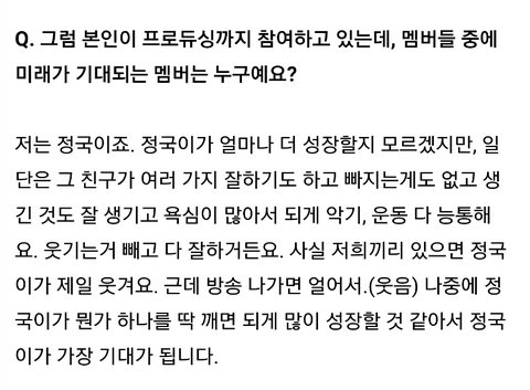 이런 말 할 때마다 정국이뿐만 아니라 멤버 하나하나를 진심으로 생각하고 있구나 생각이 듦. 가족이 아닌 이상 누군가의 성장을 기대한다는게 어려운 일일 수도 있는데 방탄은 개개인의 욕심보다는 서로를 위하고 방탄을 위하는거 같아서 너무 보기 좋다ㅠㅠㅠ