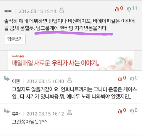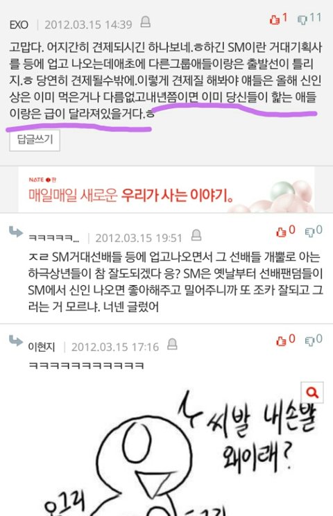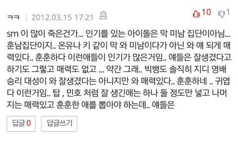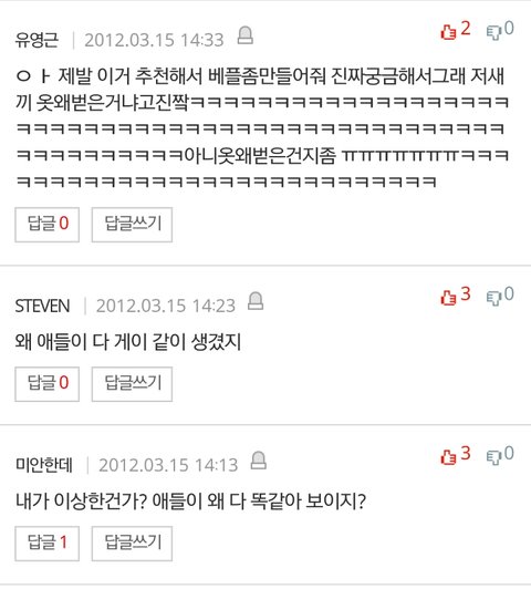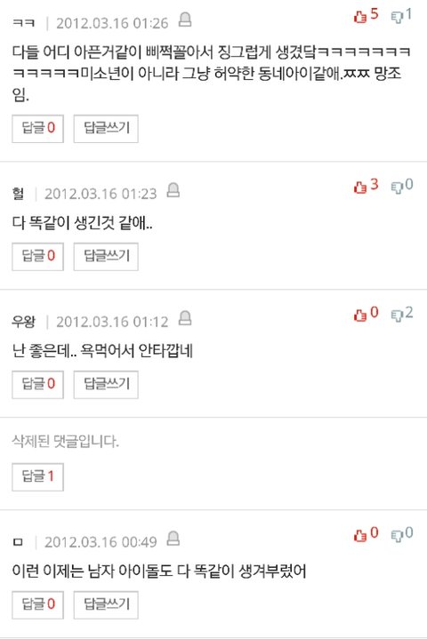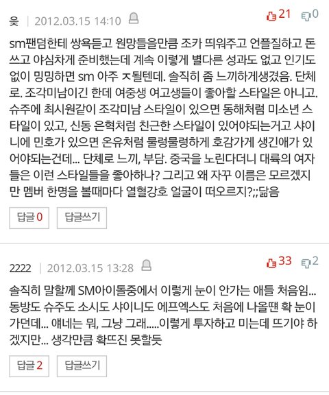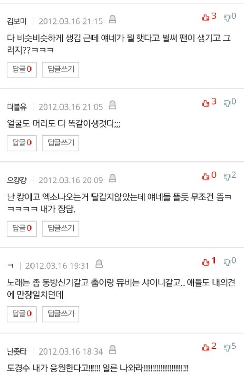 ㅅㅂ애들 외모로 까는게 젤웃겨 훈남스타일?ㅋㅋㅋㅋㅋ 밑에두장은 성지글임 후려치기도있지만 그거빼고ㅇㅇ ㅅㅂ....눈물난다 엑소 ㄹㅇ이렇게 반응 ㅈ같았는데... 딴그룹 데뷔할때 관심도없었다면 엑소는 욕먹고자랐어 웅