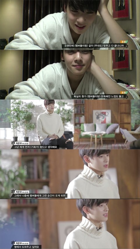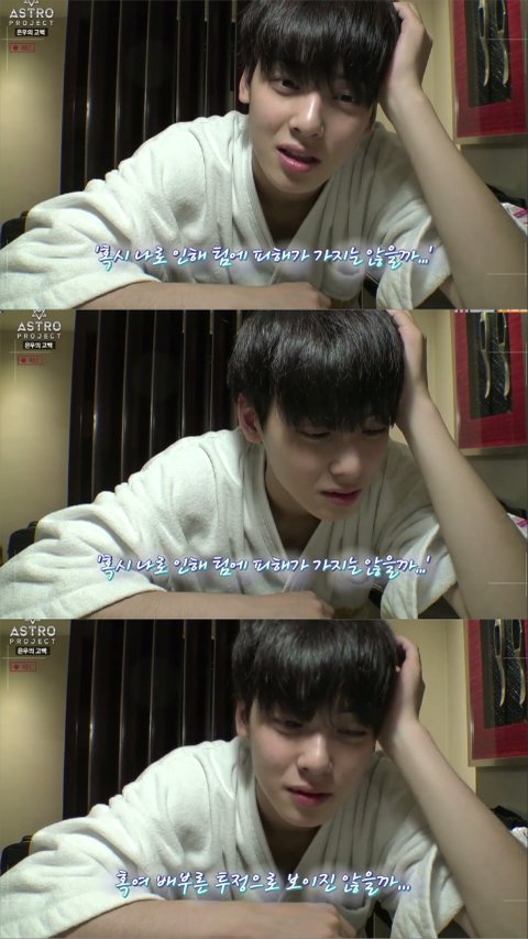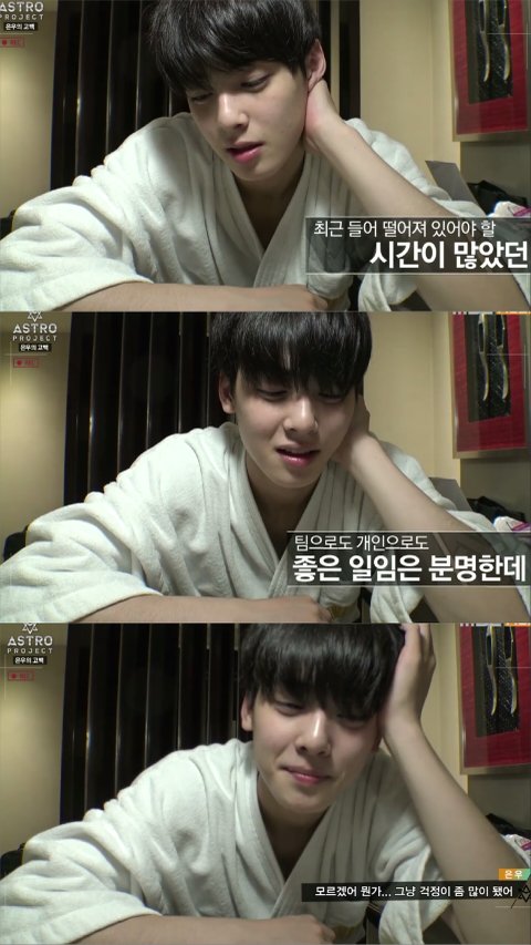 방송에서 이런말도 하고 아무래도 다른멤버들보다 더많은 스케줄이랑 그에 쌓여오는 부담감 때문인듯 자기랑 그룹에 대한 선플 악플 다본대 울기까지 하던데 아스트로 멤버들이 자기 영상 안봤음 좋겠다는것도 찡하고 여긴 참 소속사가 문제임.. 어쨋든 17년에는 아스트로 다 잘됐음 좋겠다
