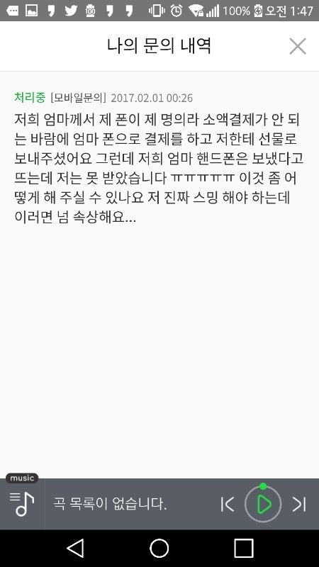 아니 그냥 진짜 너무 미안해... 나 아까 엄마께서 이용권 선물해 주셨는데 안 왔다는 앤데 ㅠㅠ 3번이나 껐다 켜보고 내가 카톡 계정으로 로그인 했었는데 혹시 몰라서 다른 계정으로 로그인 해 보고 했는데 결국에도 없어서 ㅠㅠ 문의 넣었어 아마 이게 답변이 와도 이따 오후 쯤에 올 것 같은데 오자 마자 바로 스밍 할게 대신 뮤비 스밍 중 ㅠㅠ 진짜 스밍 못 해서 넘 미안해 ㅠㅠㅠㅠㅠㅠㅠㅠㅠㅠㅠㅠㅠㅠㅠㅠㅠ