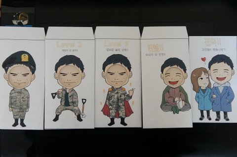봉투를 열어서 속지를 꺼내시면 레벨업이 되서 일병이된 캐릭터나 나타납니다.