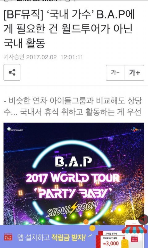 애들이 팬들도 보고싶고 노래도하고싶고 해서 다시 돌아온걸로 팬들은 생각함그래서 1년을 쉬고 2016년은 국내활동 많이 하겠지 했는데 투어 1번돌리고 그리고 2017 일본투어했고 지금 3월부터 또 투어를 시작함 지금 비에이피가 소송을 할때 팬들이 많이떠나서 국내활동을 많이해줘야되는데 지들은 돈벌어야되서 해외로 계속돌림 지금