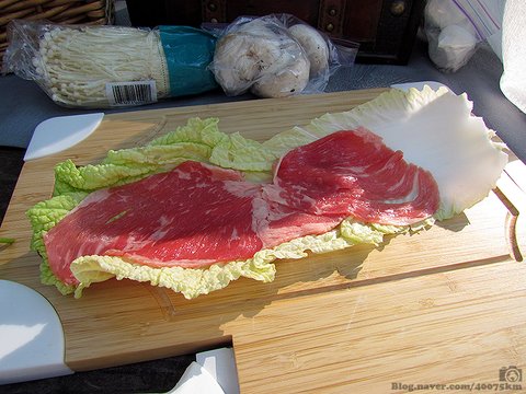 고기는 샤브샤브용으로 쓸 수 있는 쇠고기면 다 됩니다. 주로 차돌박이나 우삼겹 부위를 얇게 썰어달라고 해서 사용합니다.
