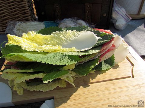 배춧잎, 고기, 깻잎, 배춧잎, 고기, 깻잎... 이렇게 3층이나 4층 정도 쌓아주면 됩니다.