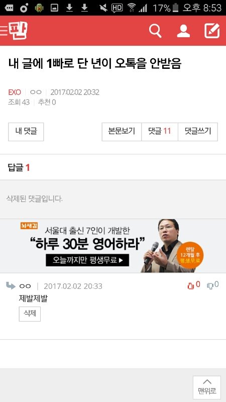 내가1빤데 ㅅㅂ? 왜 내댓지우냐