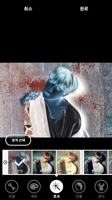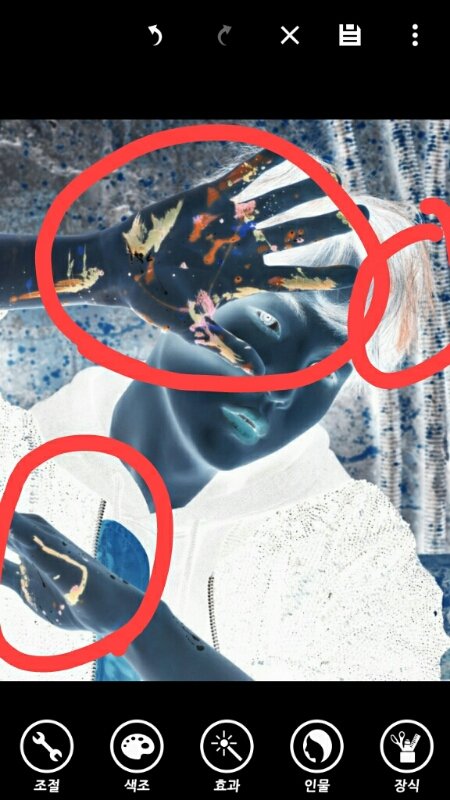 색반전하니 초록색으로 보이는 물감은 색반전 전의 사진을 보면 핑크 물감임.