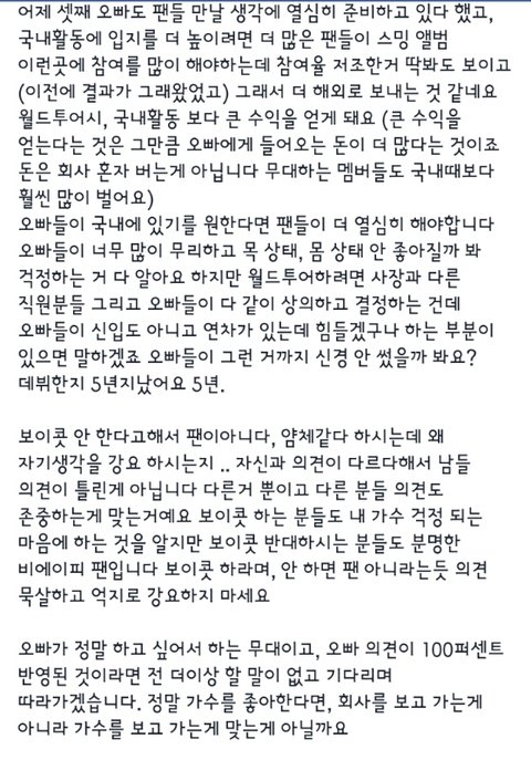 그리고 서로 다른 의견은 존중하되 비에이피 팬이라면 비에이피가 잘되는걸 바랄 건데, 어떻게 하먄 보이콧에 동참을 안하고도 비에이피가 잘 될 수 있는지 그 방법을 알려주길 바람.