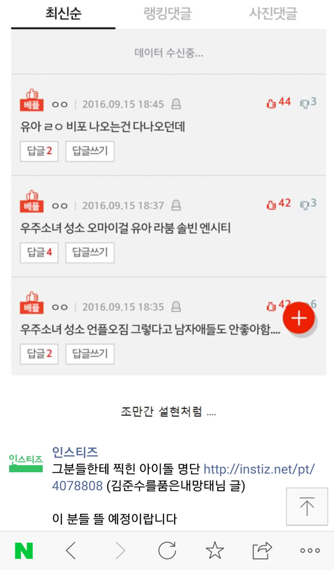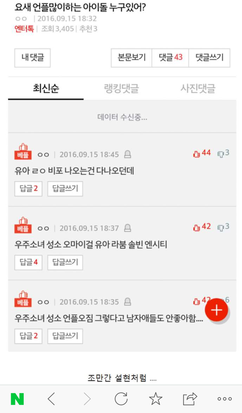 아니 제목봐ㅋㅋㅋㅋㅋㅋㅋㅋㅋㅋㅋㅋㅋ대세판독기에 걸려버린 아이린이래 제목이좀 짜증나긴하는데 댓글이 개판임 우리생각하고 댓글쓰자 물론 저건엔터글이겟지만.. 인티에서 판욕을할줄이야